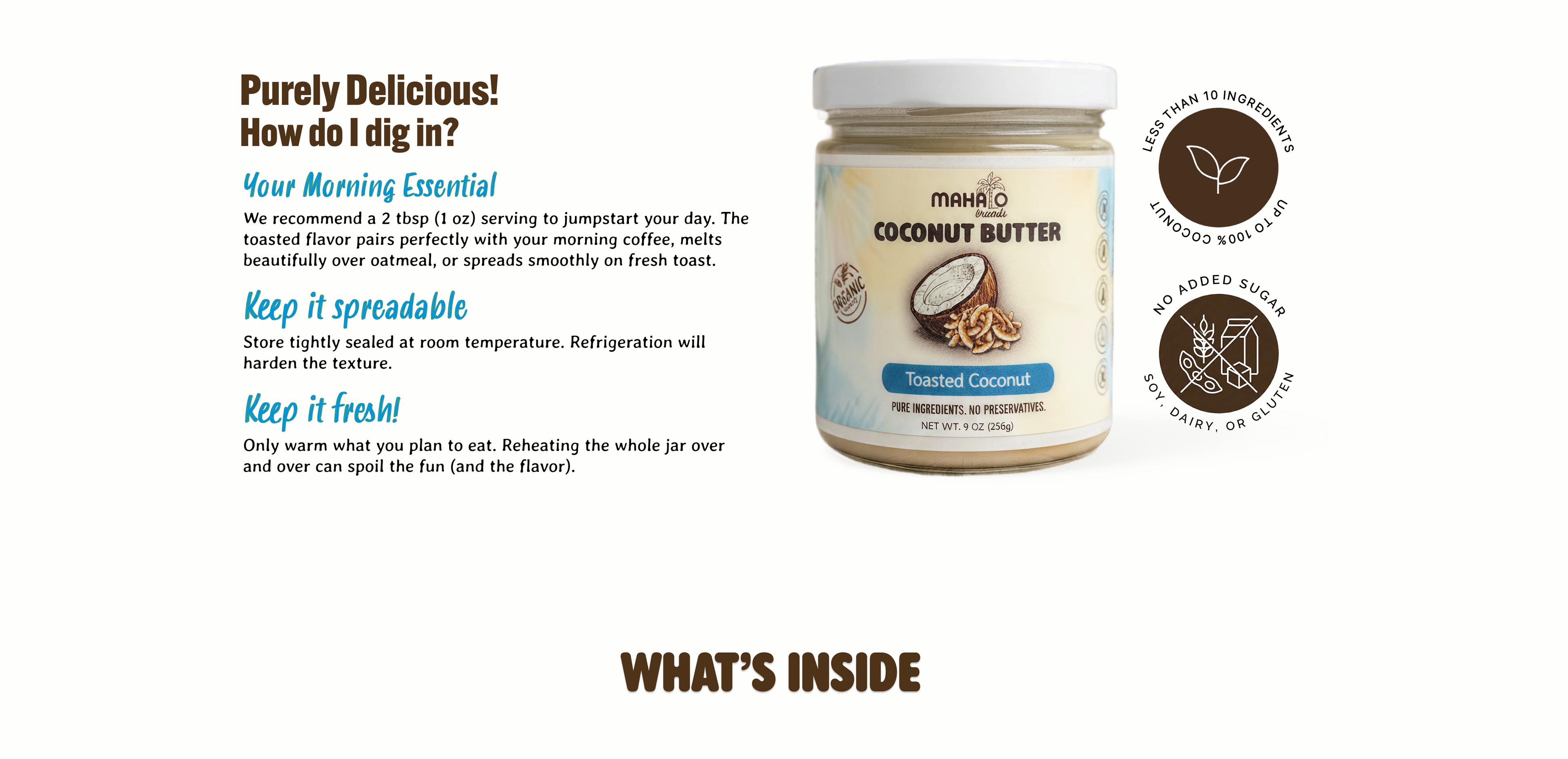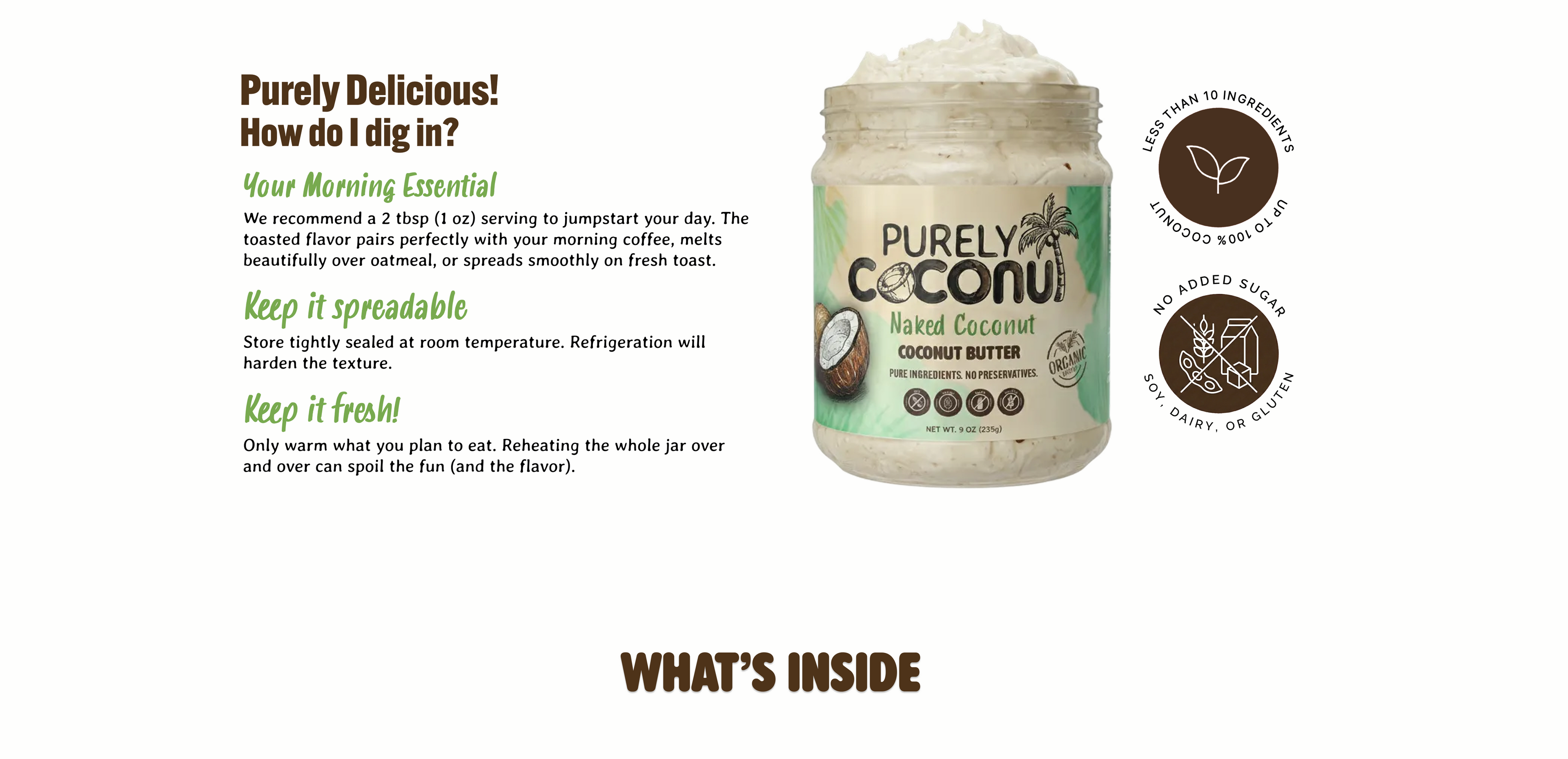 Coconut butter is temperature-sensitive. If your house is cool (below 76°F), it may solidify. To soften it, you can place the jar in a bowl of warm water for a few minutes or microwave it (without the lid!) for 10–15 seconds and stir.